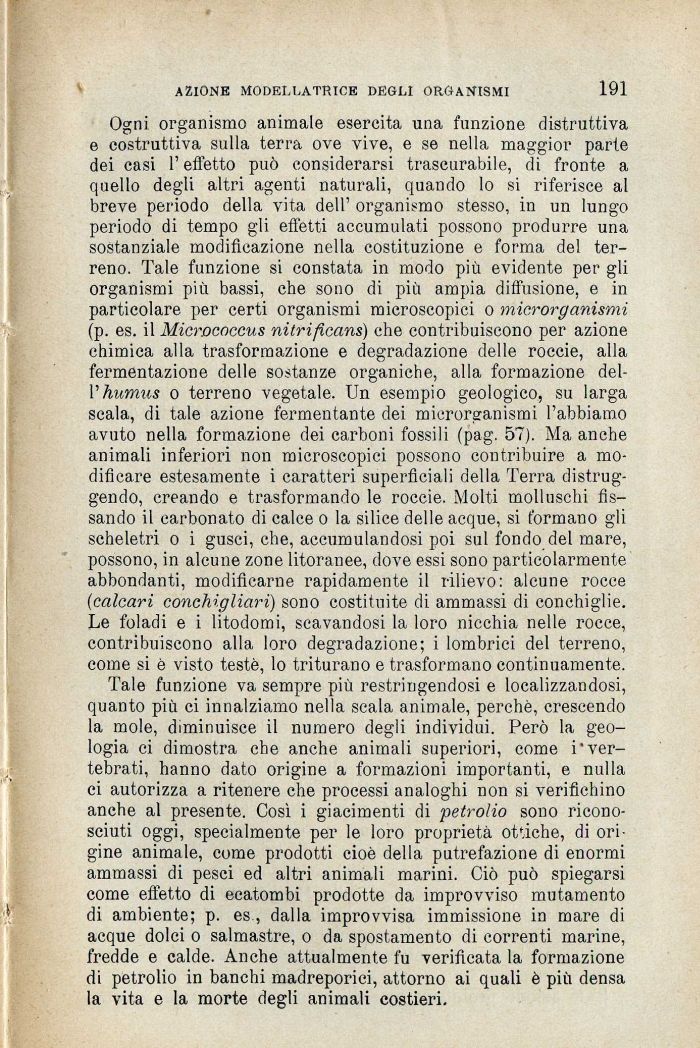 Ogni organismo animale esercita una funzione distruttiva e costruttiva sulla terra ove vive, e se nella maggior parte dei casi l'effetto può considerarsi trascurabile, di fronte a quello degli altri agenti naturali, quando lo si riferisce al breve periodo della vita dell' organismo stesso, in un lungo periodo di tempo gli effetti accumulati possono produrre una sostanziale modificazione nella costituzione e forma del terreno. Tale funzione si constata in modo più evidente per gli organismi più bassi, che sono di più ampia diffusione, e in particolare per certi organismi microscopici o microrganismi (p. es. il Micrococcus nitrificans) che contribuiscono per azione chimica alla trasformazione e degradazione delle roccie, alla fermentazione delle sostanze organiche, alla formazione deb P humus o terreno vegetale. Un esempio geologico, su larga scala, di tale azione fermentante dei microrganismi l'abbiamo avuto nella formazione dei carboni fossili (pag. 57). Ma anche animali inferiori non microscopici possono contribuire a modificare estesamente i caratteri superficiali della Terra distruggendo, creando e trasformando le roccie. Molti molluschi fissando il carbonato di calce o la silice delle acque, si formano gli scheletri o i gusci, che, accumulandosi poi sul fondo del mare, possono, in alcune zone litoranee, dove essi sono particolarmente abbondanti, modificarne rapidamente il rilievo: alcune rocce (calcari conchigliari) sono costituite di ammassi di conchiglie. Le foladi e i litodomi, scavandosi la loro nicchia nelle rocce, contribuiscono alla loro degradazione; i lombrici del terreno, come si è visto testé, lo triturano e trasformano continuamente.