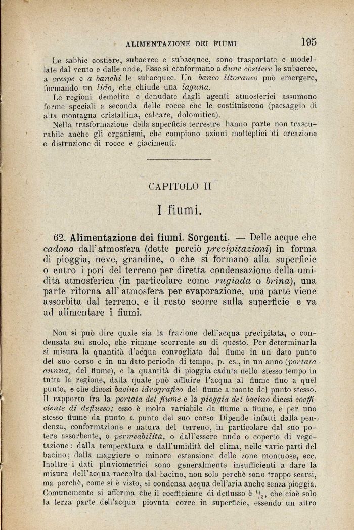 62. Alimentazione dei fiumi. Sorgenti. — Delle acque che cadono dall'atmosfera (dette perciò precipitazioni) in forma di pioggia, neve, grandine, o che si formano alla superficie o entro i pori del terreno per diretta condensazione della umidità atmosferica (in particolare come rugiada o brina), una parte ritorna all' atmosfera per evaporazione, una parte viene assorbita dal terreno, e il resto scorre sulla superficie e va ad alimentare i fiumi.