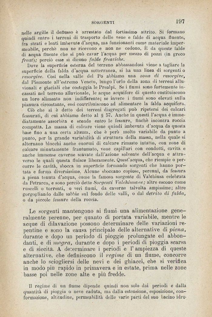 Ciò che si è detto dei terreni disgregati può ripetersi dei calcari fessurati, di cui abbiamo detto al § 57. Anche in questi l'acqua è immediatamente assorbita e scende entro le fessure, finché incontra roccia compatta. La massa di calcare viene quindi imbevuta d'acqua da questa base fino a una certa altezza, che è però molto variabile da punto a punto, per la grande variabilità di struttura della massa, nella quale si alternano blocchi anche enormi di calcare rimasto intatto, con zone di calcare minutamente frantumato, vene capillari con condotti, cavità e anche immense caverne scavate dall'azione solvente dell'acqua e attraverso le quali questa fluisce liberamente. Quest'acqua, che riempie o percorre le cavità, sbocca in superficie formando sorgenti che hanno portata e forma diversissime. Alcune sboccano copiose, perenni, da fessura a piena tenuta d'acqua, come la famosa sorgente di Valchiusa celebrata da Petrarca, e sono perciò dette Sorgenti Valchiusane : altre escono come ruscelli o torrenti, o veri fiumi, da caverne talvolta ampissime; altre gorgogliando dalle sabbie sul fondo delle valli, o dal detrito di falda, o da piccole fessure della roccia.