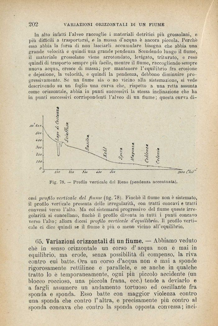 cesi profilo verticale del fiume (fig. 78). Finché il fiume non è sistemato, il profilo verticale presenta delle irregolarità, con tratti concavi e tratti convessi verso l'alto. Ma col sistemarsi progressivo del fiume queste irregolarità si cancellano, finche il profilo diventa in tutti i punti concavo verso l'alto; allora dicesi profilo verticale d'equilibrio. Il profilo verticale ci dice quindi se il fiume è più o meno vicino all'equilibrio.