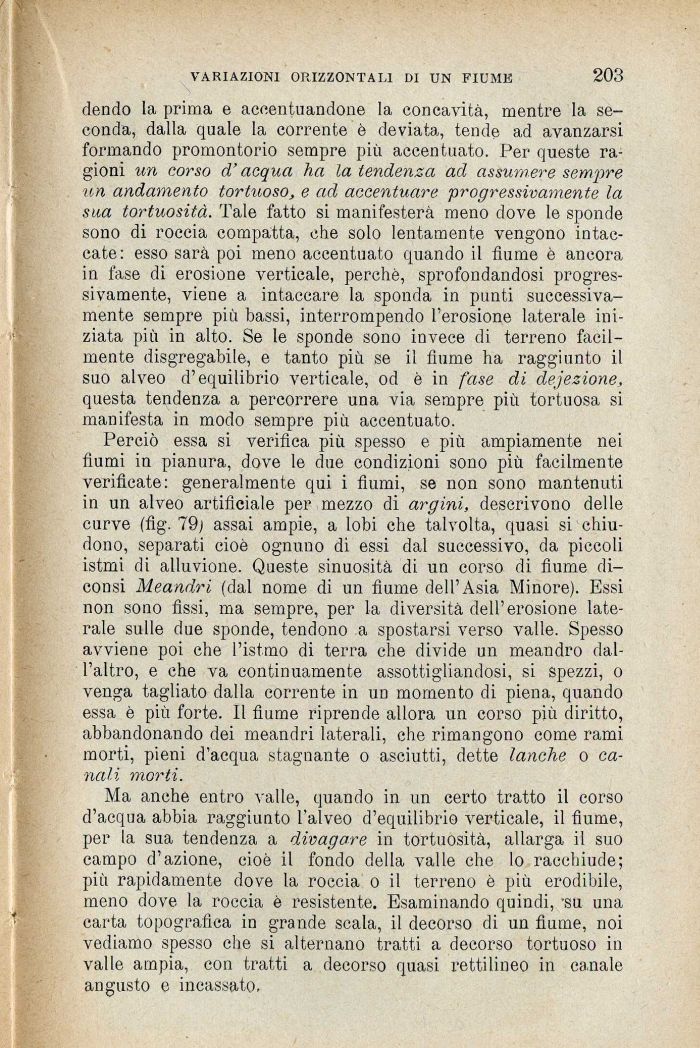 Perciò essa si verifica più spesso e più ampiamente nei fiumi in pianura, dove le due condizioni sono più facilmente verificate: generalmente qui i fiumi, se non sono mantenuti in un alveo artificiale per mezzo di argini, descrivono delle curve (fig. 79 j assai ampie, a lobi che talvolta, quasi si chiudono, separati cioè ognuno di essi dal successivo, da piccoli istmi di alluvione. Queste sinuosità di un corso di fiume di-consi Meandri (dal nome di un fiume dell'Asia Minore). Essi non sono fissi, ma sempre, per la diversità dell'erosione laterale sulle due sponde, tendono a spostarsi verso valle. Spesso avviene poi che l'istmo di terra che divide un meandro dall'altro, e che va continuamente assottigliandosi, si spezzi, o venga tagliato dalla corrente in un momento di piena, quando essa è più forte. Il fiume riprende allora un corso più diritto, abbandonando dei meandri laterali, che rimangono come rami morti, pieni d'acqua stagnante o asciutti, dette lanche o canali morti.
