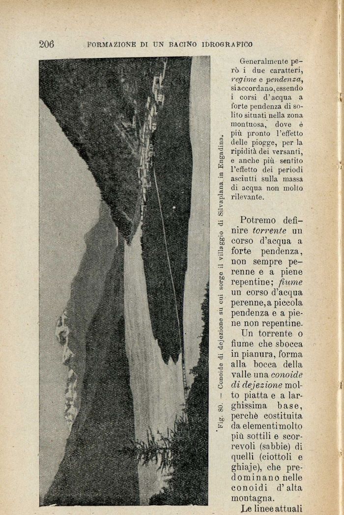 Un torrente o fiume che sbocca in pianura, forma alla bocca della valle una conoide di dejezione molto piatta e a larghissima base, perchè costituita da elementi molto più sottili e scorrevoli (sabbie) di quelli (ciottoli e ghiaje), che predominano nelle conoidi d'alta montagna.