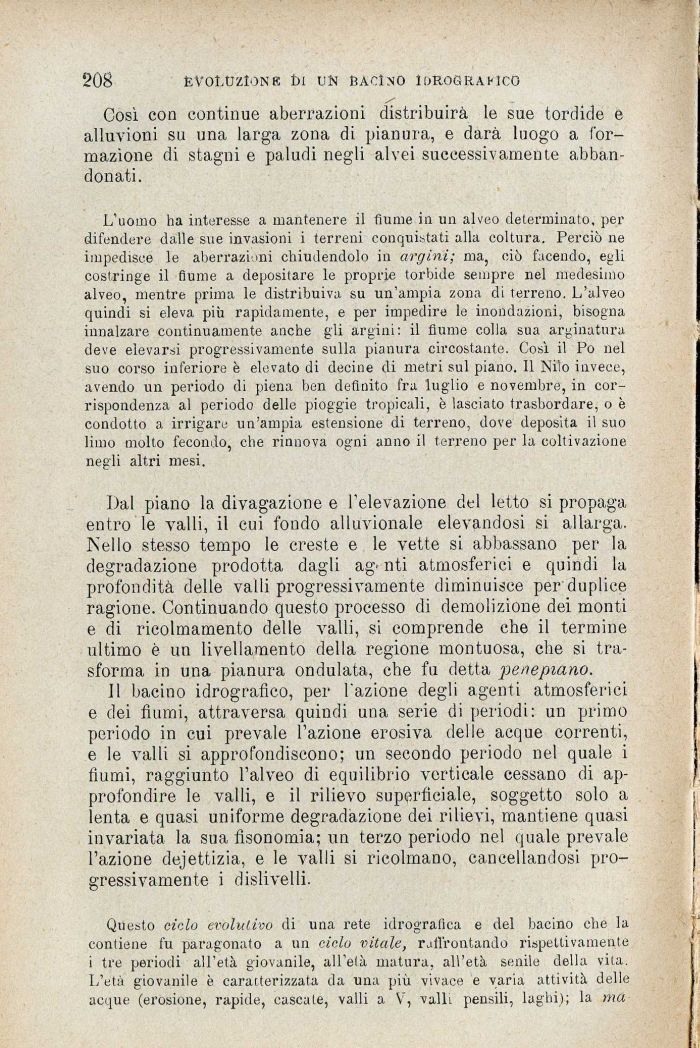 11 bacino idrografico, per l'azione degli agenti atmosferici e dei fiumi, attraversa quindi una serie di periodi: un primo periodo in cui prevale l'azione erosiva delle acque correnti, e le valli si approfondiscono; un secondo periodo nel quale i fiumi, raggiunto l'alveo di equilibrio verticale cessano di approfondire le valli, e il rilievo superficiale, soggetto solo a lenta e quasi uniforme degradazione dei rilievi, mantiene quasi invariata la sua fisonomia; un terzo periodo nel quale prevale l'azione dejettizia, e le valli si ricolmano, cancellandosi progressivamente i dislivelli.