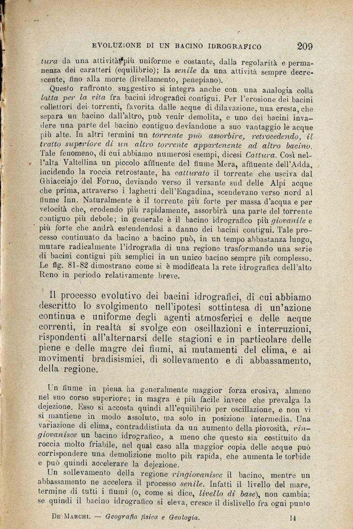 Questo raffronto suggestivo si integra anche con una analogia colla latta per la vita fra bacini idrografici contigui. Per l'erosione dei bacini collettori dei torrenti, favorita dalle acque di dilavazione, una cresta, che separa un bacino dall'altro, può venir demolita, e uno dei bacini invadere una parte del bacino contiguo deviandone a suo vantaggio le acque più alte. In altri termini un torrente può assorbire, retrocedendo, il tratto superiore di un altro torrente appartenente ad altro bacino. Tale fenomeno, di cui abbiamo numerosi esempi, dicesi Cattura. Così nell'alta Valtellina un piccolo affluente del fiume Mera, affluente dell'Adda, incidendo la roccia retrostante, ha catturato il torrente che usciva dal Ghiacciajo del Forno, deviando verso il versante sud delle Alpi acque che prima, attraverso i laghetti dell'Engadina, scendevano verso nord al fiume Inn. Naturalmente è il torrente più forte per massa d'acqua e per velocità che, erodendo più rapidamente, assorbirà una parte del torrente contiguo più debole ; in generale è il bacino idrografico più giovanile e più forte che andrà estendendosi a danno dei bacini contigui. Tale processo continuato da bacino a bacino può, in un tempo abbastanza lungo, mutare radicalmente l'idrografia di una regione trasformando una serie di bacini contigui più semplici in un unico bacino sempre più complesso. Le flg. 81-82 dimostrano come si è modificata la rete idrografica dell'alto Reno in periodo relativamente breve.