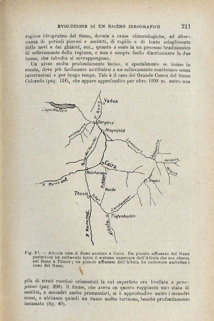 Fig. 8*. — Attuale rete di fiumi attorno a Coirà Un piccolo attinente del Reno posteriore ha catturato tutto il sistema superiore dell'Albula che ora sbocca nel Reno a Thusis ; un piccolo affluente dell'Albula ha catturato ambedue i rami del Reno.