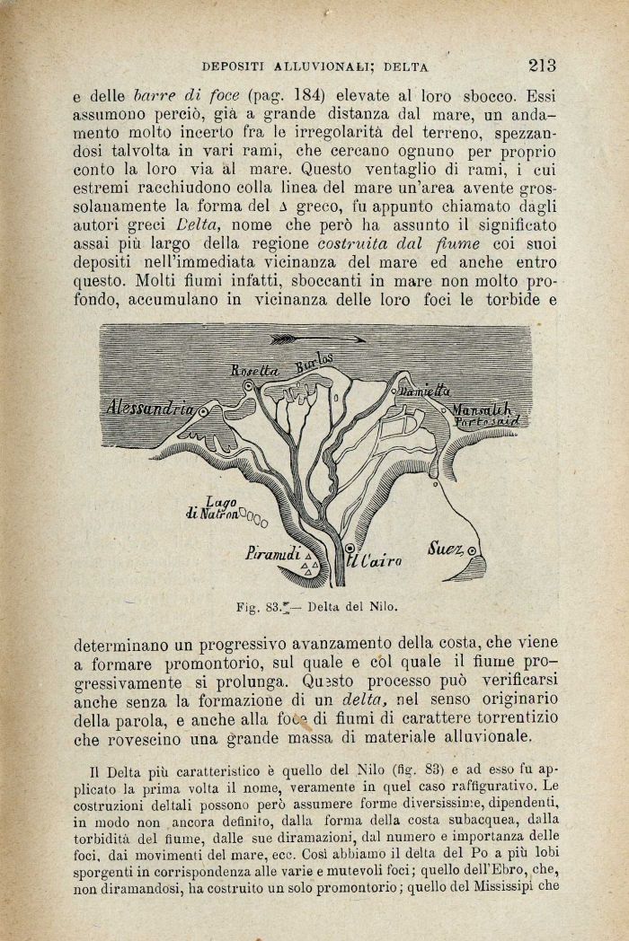 Il Delta più caratteristico è quello del Nilo (fio-. 83) e ad esso fu applicato la prima volta il nome, veramente in quel caso raffigurativo. Le costruzioni del tali possono però assumere forme diversissime, dipendenti, in modo non ancora definito, dalla forma della costa subacquea, dalla torbidità del fiume, dalle sue diramazioni, dal numero e importanza delle foci, dai movimenti del mare, ecc. Cosi abbiamo il delta del Po a più lobi sporgenti in corrispondenza alle varie e mutevoli foci; quello dell'Ebro, che, non diramandosi, ha costruito un solo promontorio ; quello del Mississipi che