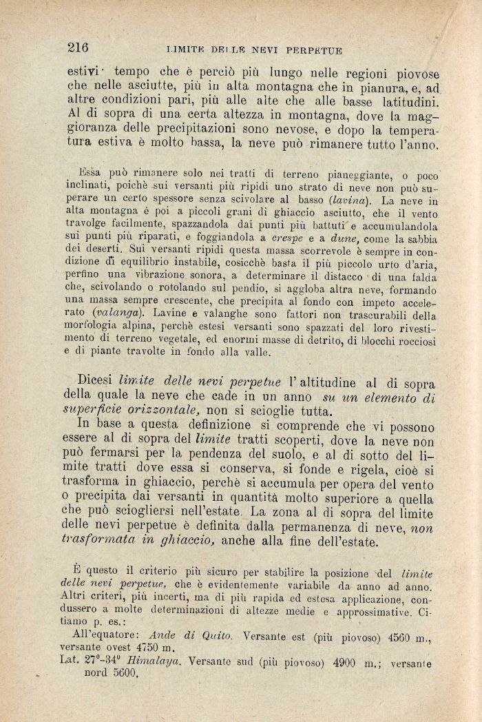E questo il criterio più sicuro per stabilire la posizione del limite delle nevi perpetue, che è evidentemente variabile da anno ad anno. Altri criteri, più incerti, ma di più rapida ed estesa applicazione, condussero a molte determinazioni di altezze medie e approssimative. Citiamo p. es. :