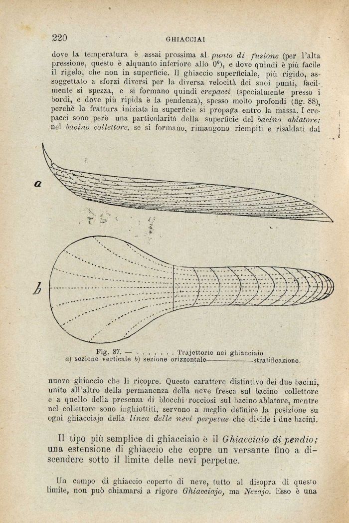 dove la temperatura è assai prossima al punto di fusione (per l'alta pressione, questo è alquanto inferiore allo 0°), e dove quindi è più fàcile il rigelo, che non in superficie. Il ghiaccio superficiale, più rigido, assoggettato a sforzi diversi per la diversa velocità dei suoi punti, facilmente si spezza, e si formano quindi crepacci (specialmente presso i bordi, e dove più ripida è la pendenza), spesso molto profondi (flg. 88), perchè la frattura iniziata in superfìcie si propaga entro la massa. I crepacci sono però una particolarità della superficie del bacino oblatore: nel bacino collettore, se si formano, rimangono riempiti e risaldati dal