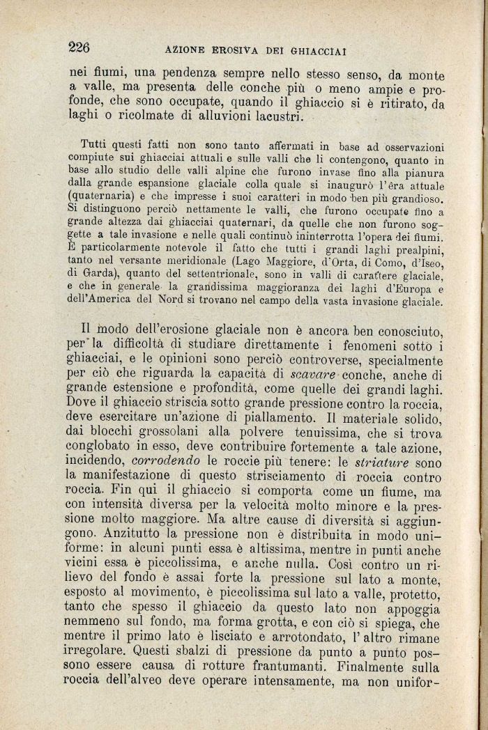 Il modo dell'erosione glaciale non è ancora ben conosciuto, per'la difficoltà di studiare direttamente i fenomeni sotto i ghiacciai, e le opinioni sono perciò controverse, specialmente per ciò che riguarda la capacità di scavare conche, anche di grande estensione e profondità, come quelle dei grandi laghi. Dove il ghiaccio striscia sotto grande pressione contro la roccia, deve esercitare un'azione di piallamento. Il materiale solido, dai blocchi grossolani alla polvere tenuissima, che si trova conglobato in esso, deve contribuire fortemente a tale azione, incidendo, corrodendo le roccie più tenere: le striature sono la manifestazione di questo strisciamento di roccia contro roccia. Fin qui il ghiaccio si comporta come un fiume, ma con intensità diversa per la velocità molto minore e la pressione molto maggiore. Ma altre cause di diversità si aggiungono. Anzitutto la pressione non è distribuita in modo uniforme: in alcuni punti essa è altissima, mentre in punti anche vicini essa è piccolissima, e anche nulla. Così contro un rilievo del fondo è assai forte la pressione sul lato a monte, esposto al movimento, è piccolissima sul lato a valle, protetto, tanto che spesso il ghiaccio da questo Iato non appoggia nemmeno sul fondo, ma forma grotta, e con ciò si spiega, che mentre il primo lato è lisciato e arrotondato, 1' altro rimane irregolare. Questi sbalzi di pressione da punto a punto possono essere causa di rotture frantumanti. Finalmente sulla roccia dell'alveo deve operare intensamente, ma non unifor-