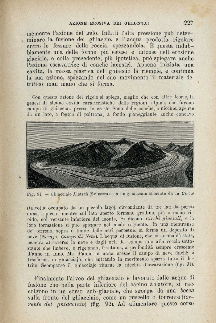 (talvolta occupato da un piccolo lago), circondante da tre lati da pareti quasi a picco, mentre sul lato aperto formano gradino, più o meno ripido, col versante inferiore del monte. Si dicono Circhi glaciali, e la loro formazione si può spiegare nel modo seguente. In una rientranza del terreno, sopra il limite delle nevi perpetue, si forma un deposito di neve (Nevajo, Campo di Neve). L'acqua di fusione, che si forma d'estate, penetra attraverso la neve e dagli orli del campo fino alla roccia sottostante che imbeve, e rigelando, frantuma, a profondità sempre crescente d'anno in anno. Ma d'anno in anno cresce il campo di neve finche si trasforma in ghiacciajo, che entrando in movimento spazza tutto il detrito. Scomparso il ghiacciajo rimane la nicchia d'escavazione (fig. 91).