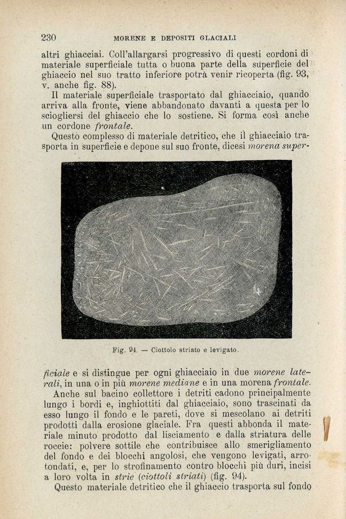 Anche sul bacino collettore i detriti cadono principalmente lungo i bordi e, inghiottiti dal ghiacciaio, sono trascinati da esso lungo il fondo e le pareti, dove si mescolano ai detriti prodotti dalla erosione glaciale. Fra questi abbonda il materiale minuto prodotto dal lisciamento e dalla striatura delle roccie: polvere sottile che contribuisce allo smerigliamento del fondo e dei blocchi angolosi, che vengono levigati, arrotondati, e, per lo strofinamento contro blocchi più duri, incisi a loro volta in strie (ciottoli striati) (fig. 94).