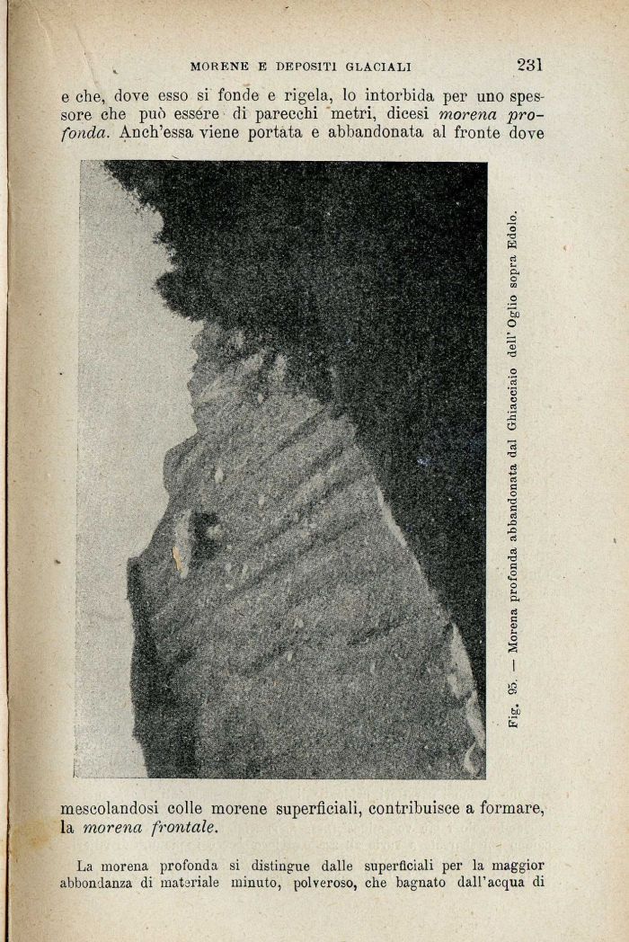 e che, dove esso si fonde e rigela, lo intorbida per uno spessore che puņ essere di parecchi metri, dicesi morena profonda. Anch'essa viene portata e abbandonata al fronte dove
