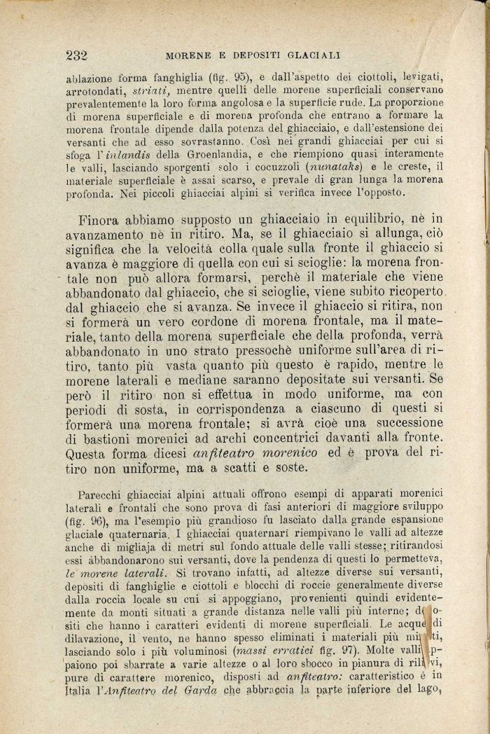 Parecchi ghiacciai alpini attuali offrono esempi di apparati morenici laterali e frontali che sono prova di fasi anteriori di maggiore sviluppo (fig. 96), ma l'esempio più grandioso fu lasciato dalla grande espansione glaciale quaternaria. I ghiacciai quaternari riempivano le valli ad altezze anche di migliaja di metri sul fondo attuale delle valli stesse; ritirandosi essi abbandonarono sui versanti, dove la pendenza di questi lo permetteva, le morene laterali. Si trovano infatti, ad altezze diverse sui versanti, depositi di fanghiglie e ciottoli e blocchi di roccie generalmente diverse dalla roccia locale su cui si appoggiano, provenienti quindi evidentemente da monti situati a grande distanza nelle valli più interne; d( Io-siti che hanno i caratteri evidenti di morene superficiali. Le acquéidi dilavazione, il vento, ne hanno spesso eliminati i materiali più mi) pti, lasciando solo i più voluminosi (massi erratici fig. 97). Molte valli! appaiono poi sbarrate a varie altezze o al loro sbocco in pianura di rila vi, pure dì carattere morenico, disposti ad anfiteatro: caratteristico è in Italia Anfiteatro del Garda che abbraccia la parte inferiore del lago,
