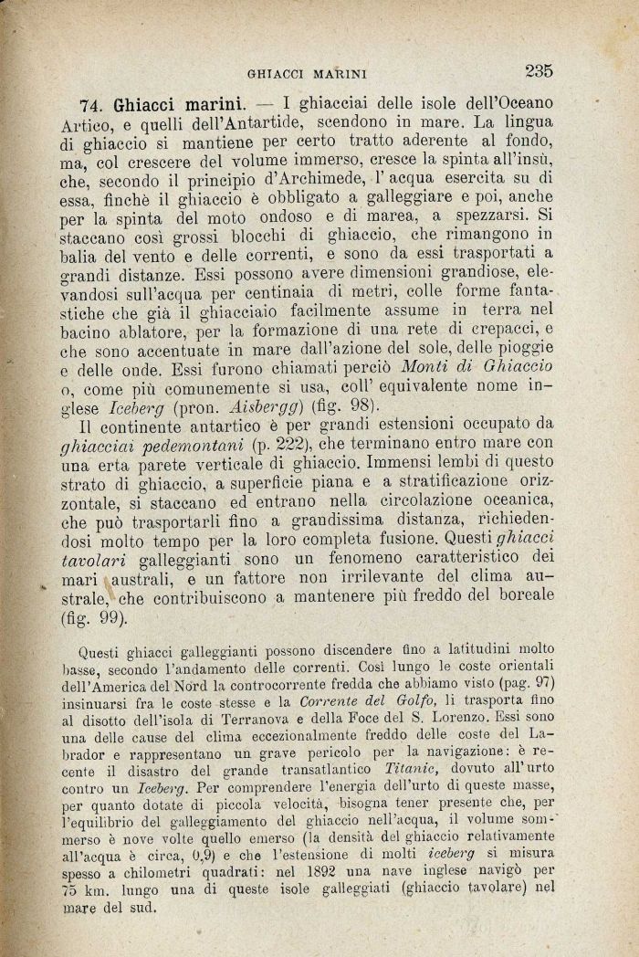 Questi ghiacci galleggianti possono discendere fino a latitudini molto basse, secondo l'andamento delle correnti. Così lungo le coste orientali dell'America del Nord la controcorrente fredda che abbiamo visto (pag. 97) insinuarsi fra le coste stesse e la Corrente del Golfo, li trasporta fino al disotto dell'isola di Terranova e della Foce del S. Lorenzo. Essi sono una delle cause del clima eccezionalmente freddo delle coste del Labrador e rappresentano un grave pericolo per la navigazione: è recente il disastro del grande transatlantico Titanio, dovuto all'urto contro un Iceberg. Per comprendere l'energia dell'urto di queste masse, per quanto dotate di piccola velocità, bisogna tener presente clie, per l'equilibrio del galleggiamento del ghiaccio nell'acqua, il volume sommerso è nove volte quello emerso (la densità del ghiaccio relativamente all'acqua è circa, 0,9) e che l'estensione eli molti iceberg si misura spesso a chilometri quadrati : nel 1892 una nave inglese navigò per 75 km. lungo una di queste isole galleggiati (ghiaccio tavolare) nel mare del sud.