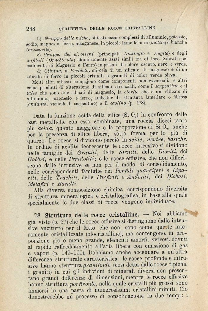 78 Struttura delle rocce cristalline. — Noi abbiamo già visto (p. 57) che le rocce effusive si distinguono dalle intrusive anzitutto per il fatto che non sono come queste interamente cristallizzate (olocristalline), ma contengono, in proporzione più o meno grande, elementi amorfi, vetrosi, dovuti al rapido raffreddamento all'aria libera con emissione di gas e vapori (p. 149-150). Dobbiamo anche accennare a un'altra differenza strutturale caratteristica : le rocce profonde e intrusive hanno struttura granitoide (così detta dalle rocce tipiche, i graniti) in cui gli individui di minerali diversi non presentano grandi differenze di dimensioni, mentre le rocce effusive hanno struttura porfiroìde, nella quale cristalli più grossi sono immersi in una pasta di numerosissimi cristallini minuti. Ciò dimostrerebbe un processo di consolidazione in due tempi: i