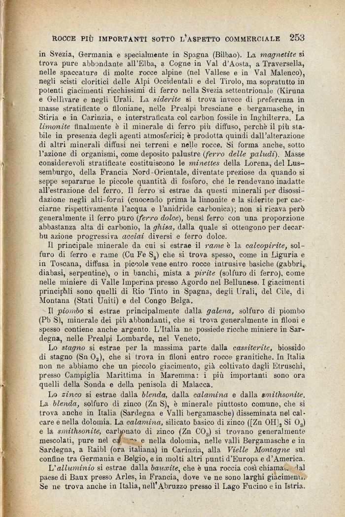 in Svezia, Germania e specialmente in Spagna (Bilbao). La magnetite si trova pure abbondante all'Elba, a Cogne in Val d'Aosta, a Traversella, nelle spaccature di molte rocce alpine (nel Vallese e in Val Malenco), negli scisti cloritici delle Alpi Occidentali e del Tirolo, ma sopratutto in potenti giacimenti ricchissimi di ferro nella Svezia settentrionale (Kiruna e Gellìvare e negli Urali. La siderite si trova invece di preferenza in inasse stratificate o filoniane, nelle Prealpi bresciane e bergamasche, in Stiria e in Carinzia, e interstraficata col carbon fossile in Inghilterra. La limonile finalmente è il minerale di ferro più diffuso, perchè il più stabile in presenza degli agenti atmosferici; è prodotta quindi dall'alterazione di altri minerali diffusi nei terreni e nelle rocce. Si forma anche, sotto l'azione di organismi, come deposito palustre (ferro delle paludi). Masse considerevoli stratificate costituiscono le minettes della Lorena, del Lussemburgo, della Francia Nord-Orientale, diventate preziose da quando si seppe separarne le piccole quantità di fosforo, che le rendevano inadatte all'estrazione del ferro. Il ferro si estrae da questi minerali per disossidazione negli alti-forni (cuocendo prima la limonite e la siderite per cacciarne rispettivamente l'acqua e l'anidride carbonica); non si ricava però generalmente il ferro puro (ferro dolce), bensì ferro con una proporzione abbastanza alta di carbonio, la ghisa, dalla quale si ottengono per decar-bu azione progressiva acciai diversi e ferro dolce.