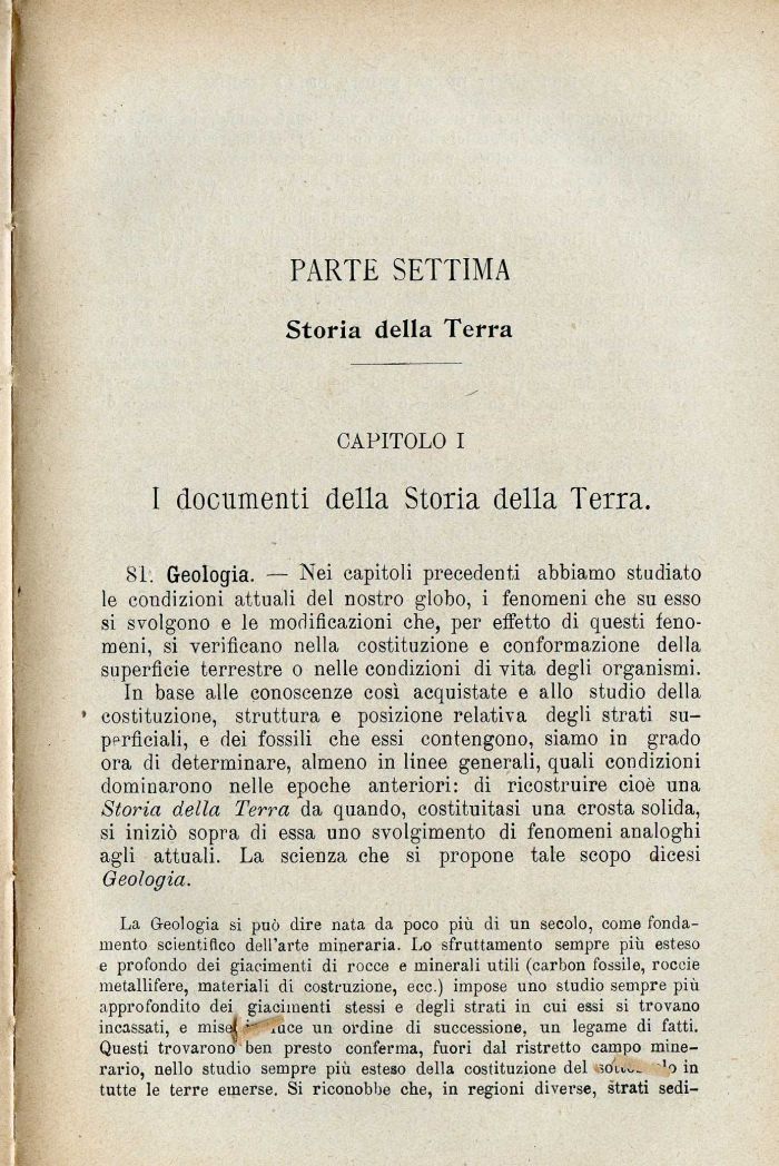 In base alle conoscenze così acquistate e allo studio della ' costituzione, struttura e posizione relativa degli strati superficiali, e dei fossili che essi contengono, siamo in grado ora di determinare, almeno in linee generali, quali condizioni dominarono nelle epoche anteriori: di ricostruire cioè una Storia della Terra da quando, costituitasi una crosta solida, si iniziò sopra di essa uno svolgimento di fenomeni analoghi agli attuali. La scienza che si propone tale scopo dicesi Geologia.
