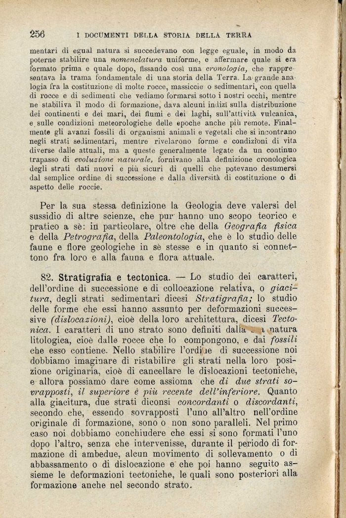 82. Stratigrafia e tee tonica. — Lo studio dei caratteri, dell'ordine di successione e di collocazione relativa, o giacitura, degli strati sedimentari dicesi Stratigrafia; lo studio delle forme che essi hanno assunto per deformazioni successive (dislocazioni), cioè della loro architettura, dicesi Tecto-nica. I caratteri di uno strato sono definiti dalia ì, x natura litologica, cioè dalle rocce che lo compongono, e dai fossili che esso contiene. Nello stabilire l'ordi'ie di successione noi dobbiamo imaginare di ristabilire gii strati nella loro posizione originaria, cioè di cancellare le dislocazioni tectoniche, e allora possiamo dare come assioma che di due strati sovrapposti, il superiore è più recente dell'inferiore. Quanto alla giacitura, due strati diconsi concordanti o discordanti, secondo che, essendo sovrapposti l'uno all'altro nell'ordine originale di formazione, sono o non sono paralleli. Nel primo caso noi dobbiamo conchiudere che essi si sono formati l'uno dopo l'altro, senza che intervenisse, durante il periodo di formazione di ambedue, alcun movimento di sollevamento o di abbassamento o di dislocazione e che poi hanno seguito assieme le deformazioni tectoniche, le quali sono posteriori alla formazione anche nel secondo strato.