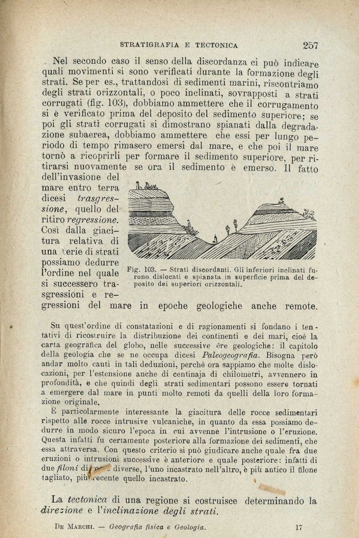 Nel secondo caso il senso della discordanza ci può indicare quali movimenti si sono verificati durante la formazione degli strati. Se per es., trattandosi di sedimenti marini, riscontriamo degli strati orizzontali, o poco inclinati, sovrapposti a strati corrugati (fig. 103), dobbiamo ammettere che il corrugamento si è verificato prima del deposito del sedimento superiore; se poi gli strati corrugati si dimostrano spianati dalla, degradazione subaerea, dobbiamo ammettere che essi per lungo periodo di tempo rimasero emersi dal mare, e che poi il mare tornò a ricoprirli per formare il sedimento superiore, per ritirarsi nuovamente se ora il sedimento è emerso. Il fatto dell'invasione del mare entro terra -JL&ak dicesi trasgressione, quello del ritiro regressione. Cosi dalla giacitura relativa di una :erie di strati possiamo dedurre l'ordine nel quale si successero trasgressioni e regressioni del mare in epoche geologiche anche remote.