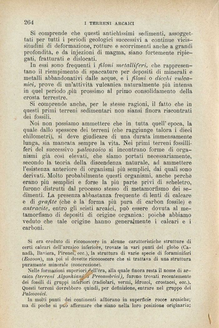 Noi non possiamo ammettere che in tutta quell' epoca, la quale dallo spessore dei terreni (che raggiunge talora i dieci chilometri), si deve giudicare di una durata immensamente lunga, sia mancata sempre la vita. Nei primi terreni fossilli-feri del successivo paleozoico si incontrano forme di organismi già così elevati, che siamo portati necessariamente, secondo la teoria della discendenza naturale, ad ammettere l'esistenza anteriore di organismi più semplici, dai quali sono derivati. Molto probabilmente questi organismi, anche perchè erano più semplici e forse la più parte privi di scheletro, furono distrutti dal processo stesso di metamorfismo dei sedimenti. La presenza abbastanza frequente di lenti di calcare e di grafite (che è la forma più pura di carbon fossile) e antracite, entro gli scisti arcaici, può essere dovuta al metamorfismo di depositi di origine organica: poiché abbiamo veduto che tale origine hanno generalmente i calcari e i carboni.