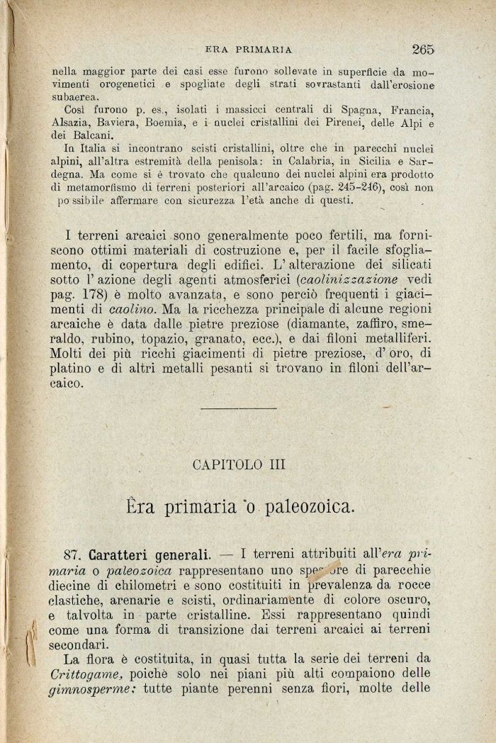 87. Caratteri generali. — I terreni attribuiti all'era primaria o paleozoica rappresentano uno spc jre di parecchie diecine di chilometri e sono costituiti in prevalenza da rocce clastiche, arenarie e scisti, ordinariamente di colore oscuro, e talvolta in parte cristalline. Essi rappresentano quindi come una forma di transizione dai terreni arcaici ai terreni secondari.