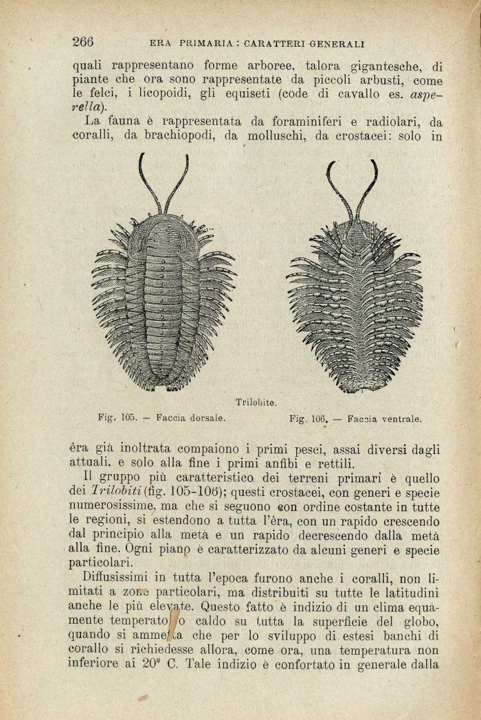 Il gruppo più caratteristico dei terreni primari è quello dei Trilobiti (fìg. 105-106); questi crostacei, con generi e specie numerosissime, ma che si seguono eon ordine costante in tutte le regioni, si estendono a tutta l'èra, con un rapido crescendo dal principio alla metà e un rapido decrescendo dalla metà alla fine. Ogni pianp è caratterizzato da alcuni generi e specie particolari.