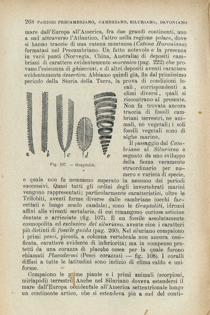 e quale non fu nemmeno superato in nessuno dei periodi successivi. Quasi tutti gli ordini degli invertebrati marini vengono rappresentati; particolarmente caratteristici, oltre le Trilobiti, aventi forme diverse dalle cambriane (occhi faccettati e lungo scudo caudale), sono le Graptoliti, idrozoi affini alle viventi sertularie, di cui rimangono curiose asticine dentate e arricciate (fig. 107). È un fossile assolutamente cosmopolita ed esclusivo del siluriano, avente cioè i caratteri più distinti di fossile guida (pag. 260). Nel siluriano compaiono i primi pesci, piccoli, a colonna vertebrale non ancora ossificata, carattere evidente di inferiorità; ma in compenso protetti da una corazza di placche ossee per la quale furono chiamati Placodermi (Pesci corazzati — fig. 108). I coralli diffusi a tutte le latitudini sono indizio di clima caldo e uniforme.