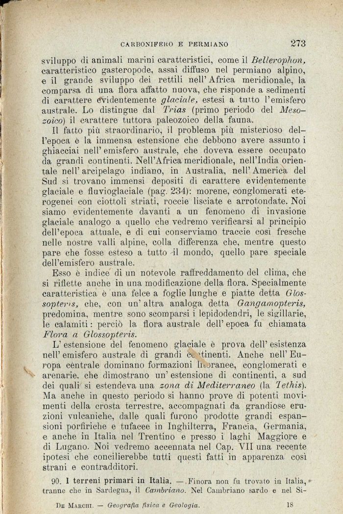 Il facto più straordinario, il problema più misterioso dell'epoca è la immensa estensione che debbono avere assunto i ghiacciai nell' emisfero australe, che doveva essere occupato da grandi continenti. Nell'Africa meridionale, nell'India orientale nell'arcipelago indiano, in Australia, nell'Americ'a del Sud si trovano immensi depositi di carattere evidentemente glaciale e fluvioglaciale (pag. 234): morene, conglomerati eterogenei con ciottoli striati, roccie lisciate e arrotondate. Noi siamo evidentemente davanti a un fenomeno di invasione glaciale analogo a quello che vedremo verificarsi al principio dell'epoca attuale, e di cui conserviamo traccie così fresche nelle nostre valli alpine, colla differenza che, mentre questo pare che fosse esteso a tutto -il mondo, quello pare speciale dell'emisfero australe.