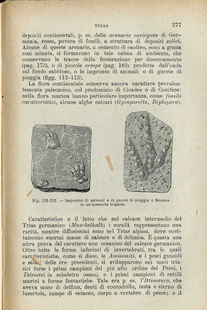 Caratteristico è il 'fatto che nel calcare intermedio del Trias germanico (Muschelkalk) i coralli rappresentano una rarità, mentre diffusissimi sono nel Trias alpino, dove costituiscono enormi masse di calcare e di dolomia. È questa una altra prova del carattere non oceanico del calcare germanico. Oltre tutte le forme inferiori di invertebrati, tra le quali caratteristiche, come si disse, le Ammoniti, e i pesci ganoidi e sela : delle ère precedenti, si svilupparono nei mari tria-sici forse i primi campioni del più alto ordine dei Pesci, i Teleostei (a scheletro osseo), e i primi campioni di rettili marini a forme fantastiche. Tale era p. es. Y Ittiosauro, che aveva muso di delfino, denti di coccodrillo, testa e sterno di lucertola, zampe di cetaceo, corpo e vertebre di pesce; e il