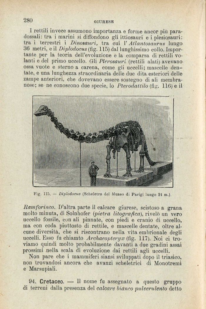 I rettili invece assumono importanza e forme ancor più paradossali: tra i marini si diffondono gli ittiosauri e i plesiosauri: tra i terrestri i Dinosauri, tra cui l'Atlantosaurus lungo 36 metri, e il Diplodocus (fig. 115) dal lunghissimo collo. Importante per la teoria dell'evoluzione è la comparsa di rettili volanti e del primo uccello. G-Ii Pterosauri (rettili alati) avevano ossa vuote e sterno a carena, come gli uccelli; mascelle dentate, e una lunghezza straordinaria delle due dita esteriori delle zampe anteriori, che dovevano essere sostegno di ali membranose; se ne conoscono due specie, lo Pterodattilo (fig. 116) e il