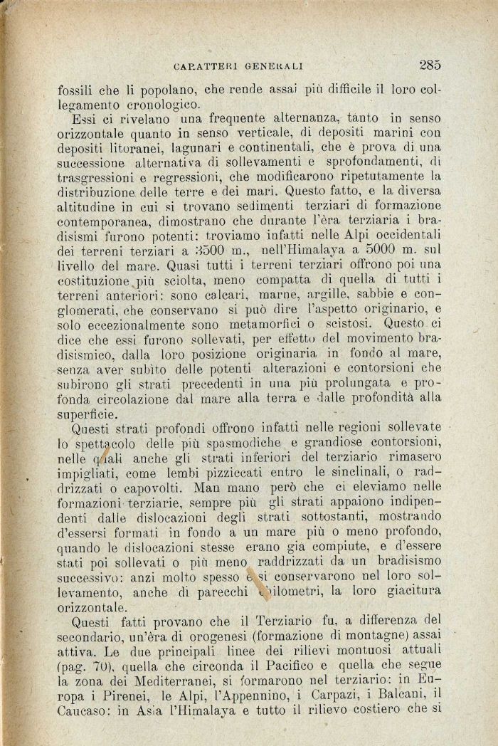 Questi strati profondi offrono infatti nelle regioni sollevate lo spettacolo delle più spasmodiche e grandiose contorsioni, nelle q/iali anche gli strati inferiori del terziario rimasero impigliati, come lembi pizziccati entro le sinclinali, o raddrizzati o capovolti. Man mano però che ci eleviamo nelle formazioni terziarie, sempre più gli strati appaiono indipendenti dalle dislocazioni degli strati sottostanti, mostrando d'essersi formati in fondo a un mare più o meno profondo, quando le dislocazioni stesse erano già compiute, e d'essere stati poi sollevati o più meno raddrizzati da un bradisismo successivo: anzi molto spesso e si conservarono nel loro sollevamento, anche di parecchi òilometri, la loro giacitura orizzontale.