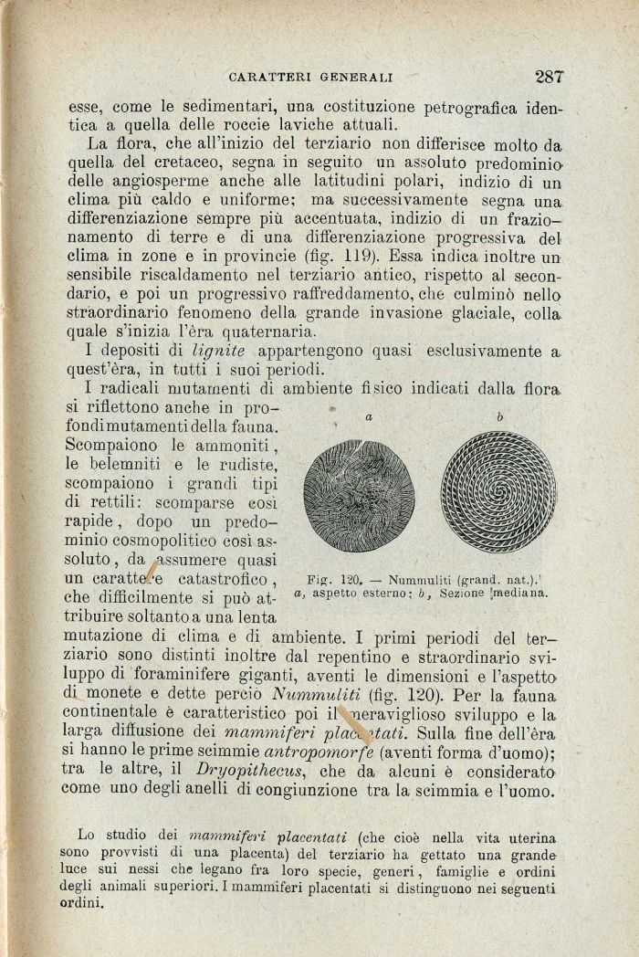 mutazione di clima e di ambiente. I primi periodi del terziario sono distinti inoltre dal repentino e straordinario sviluppo di foraminifere giganti, aventi le dimensioni e l'aspetto di monete e dette perciò Nummuliti (fig. 120). Per la fauna continentale è caratteristico poi il ueraviglioso sviluppo e la larga diffusione dei mamyniferi piaci, '¦tati. Sulla fine dell'èra si hanno le prime scimmie antropomorfe (aventi forma d'uomo); tra le altre, il Dryopithecus, che da alcuni è considerato come uno degli anelli di congiunzione tra la scimmia e l'uomo.
