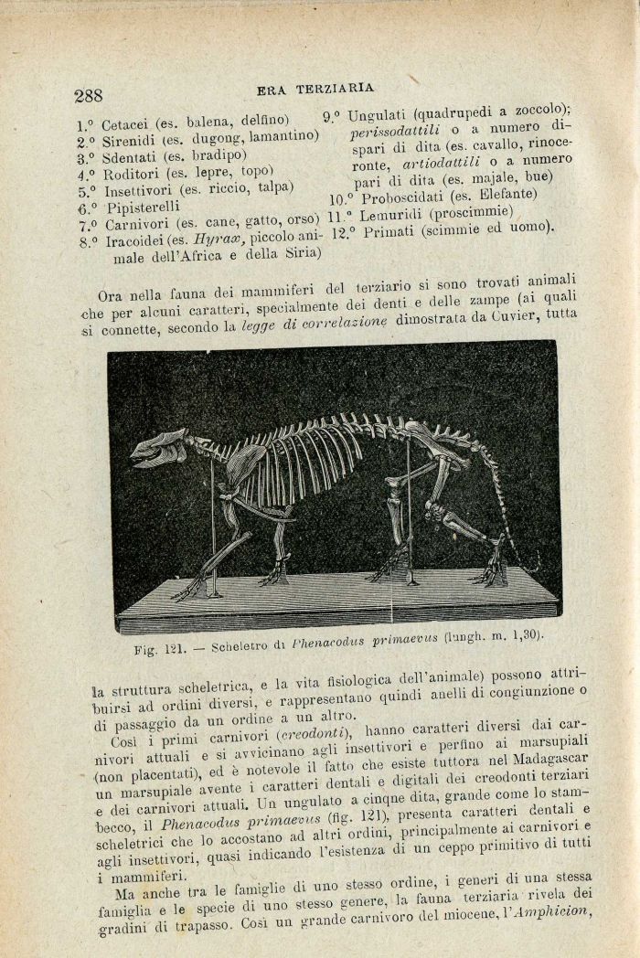 Così i primi carnivori (creodonti), hanno caratteri diversi dai carnivori attuali e si avvicinano agli insettivori e perfino ai marsupiali (non placentati), ed è notevole il fatto che esiste tuttora nel Madagascar un marsupiale avente i caratteri dentali e digitali dei creodonti terziari e dei carnivori attuali. Un ungulato a cinqne dita, grande come lo stambecco, il Phenacodus primaevus (fig. 121), presenta caratteri dentali e scheletrici che lo accostano ad altri ordini, principalmente ai carnivori e agli insettivori, quasi indicando l'esistenza di un ceppo primitivo di tutti i mammiferi.