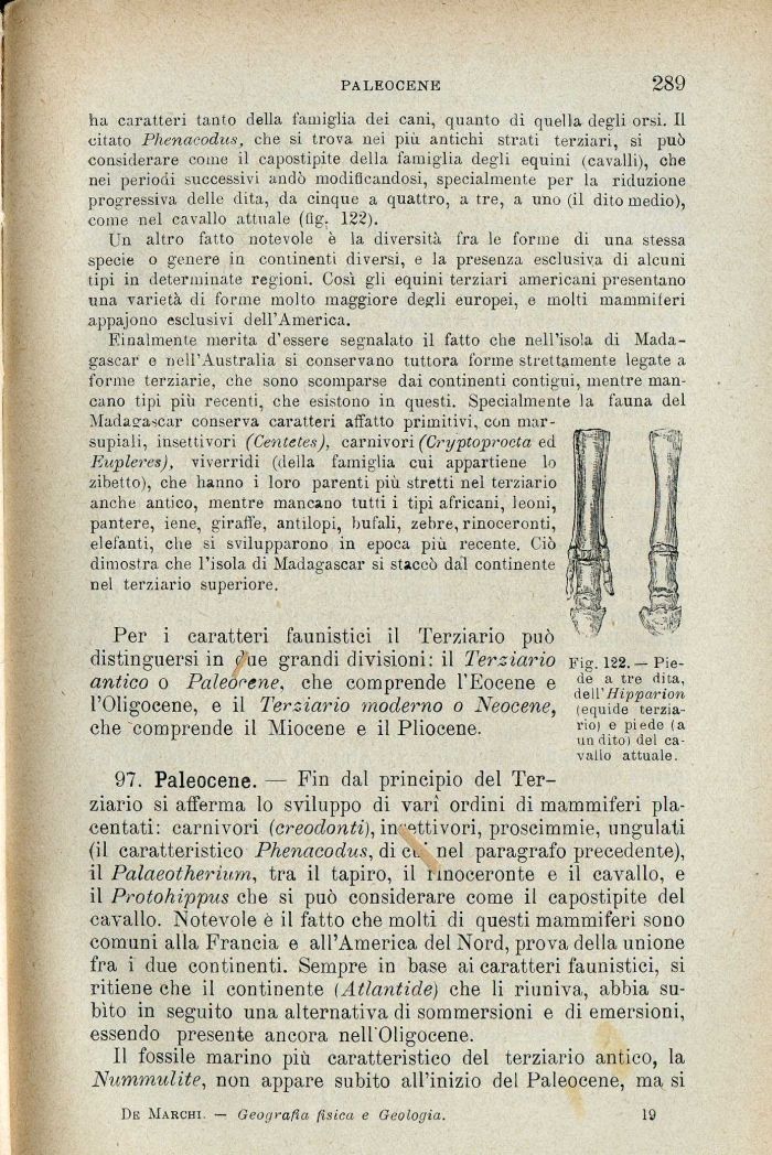 97. Paleocene. — Fin dal principio del Terziario si afferma lo sviluppo di vari ordini di mammiferi pla-centati: carnivori (creodonti), in-ettivori, proscimmie, ungulati (il caratteristico Phenacodus, di cl' nel paragrafo precedente), il Palaeotherium, tra il tapiro, il nnoceronte e il cavallo, e il Protohippns che si può considerare come il capostipite del cavallo. Notevole è il fatto che molti di questi mammiferi sono comuni alla Francia e all'America del Nord, prova della unione fra i due continenti. Sempre in base ai caratteri faunistici, si ritiene che il continente (Atlantide) che li riuniva, abbia subito in seguito una alternativa di sommersioni e di emersioni, essendo presente ancora nell'Oligocene.