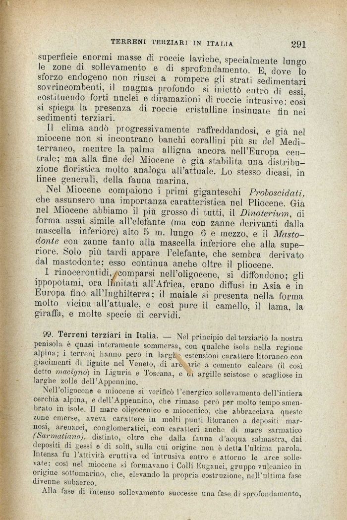 99. Terreni terziari in Italia. — Nel principio del terziario la nostra penisola è quasi interamente sommersa, con qualche isola nella regione alpina; i terreni hanno però in largì. ' estensioni carattere litoraneo con giacimenti di lignite nel Veneto, di are. irie a cemento calcare (il così detto macigno) in Liguria e Toscana, e tu argille scistose o scagliose in larghe zolle dell'Appennino.