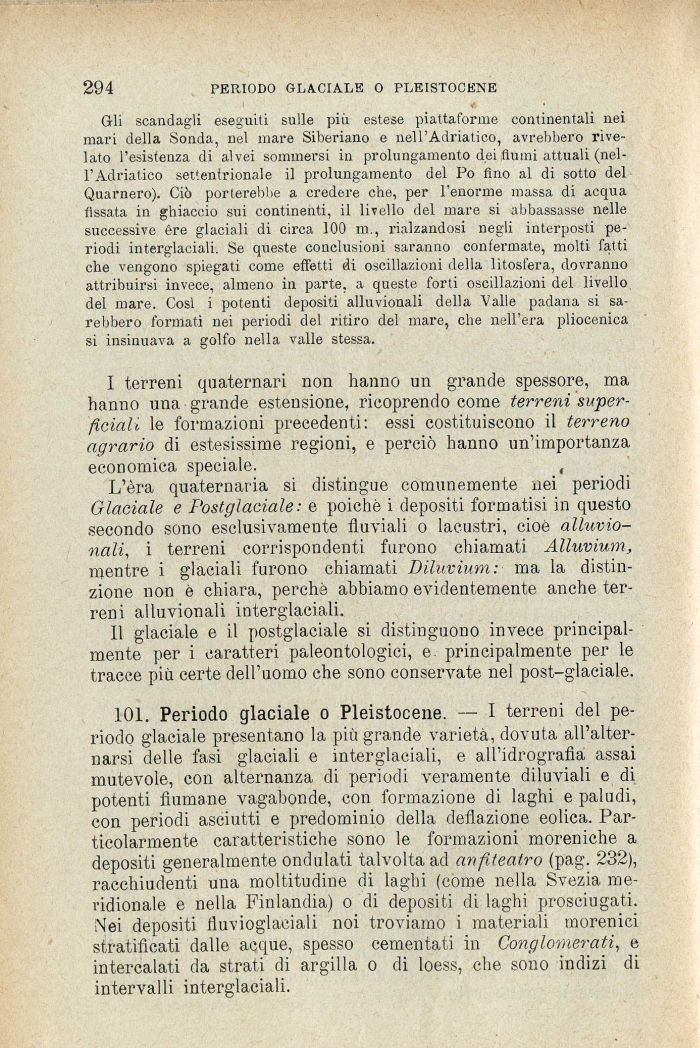 L'èra quaternaria si distingue comunemente nei periodi Glaciale e Postglaciale: e poiché i depositi formatisi in questo secondo sono esclusivamente fluviali o lacustri, cioè alluvionali, i terreni corrispondenti furono chiamati Alluvium, mentre i glaciali furono chiamati Diluvium: ma la distinzione non è chiara, perchè abbiamo evidentemente anche terreni alluvionali interglaciali.