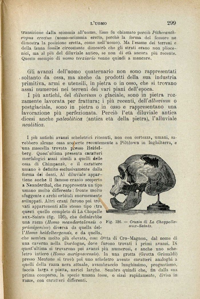 I più antichi avanzi scheletrici ritenuti, non con certezza, umani, sarebbero alcune ossa scoperte recentemente a Piltdown in Inghilterra, e una mascella trovata plesso Heidelberg. Quest'ultima presenta caratteri morfologici assai simili a quelli delle ossa di Chimpanzè, e il carattere umano è definito esclusivamente dalla •forma dei denti. Al diluviale appartiene anche il famoso cranio scoperto a Neanderthal, che rappresenta un tipo umano molto differente : fronte molto sfuggente e archi orbitali enormemente sviluppati. Altri crani furono poi tro vati appartenenti allo stesso tipo (tra questi quello completo di La Chapelle aux-Saints (fig. 126), che definirebbe una razza (Homo neandertalensis o primigenius) diversa da quella del-VHomo heidelbergensis, e da quella, ¦che sembra molto più elevata, cosi detta di Cro-Magnon, dal nome di una caverna nella Dordogne, dove furono trovati i primi avanzi. Di quest'ultima si trovarono poi avanzi più numerosi, e anche uno scheletro intiero (Homo aurignacensis). In una grotta (Grotta Grimaldi) presso Mentone si trovò poi uno scheletro avente caratteri analoghi a quelli della razza nera attuale, avambraccio lunghissimo, prognatismo, taccia larga e piatta, narici larghe. Sembra quindi che, fin dalla sua prima comparsa, la specie umana fosse, o siasi rapidamente, divisa in razze, con caratteri differenti.