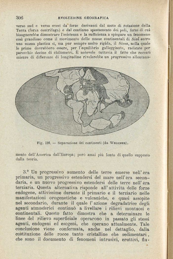 verso sud e verso ovest da forze derivanti dal moto di rotazione della Terra (forza centrifuga) e dal continuo spostamento dei poli, forze di cui bisognerebbe dimostrare l'esistenza e la sufficienza a spiegare un fenomeno cosi grandioso come il movimento delle masse continentali di Sial entro una massa plastica si, ma pur sempre molto rigida, il Sima, nella quale le prime dovrebbero essere, per l'equilibrio galleggiante, radicate per parecchie decine di chilometri. È notevole tuttavia il fatto che recenti misure di differenze di longitudine rivelerebbe un progressivo allontana-
