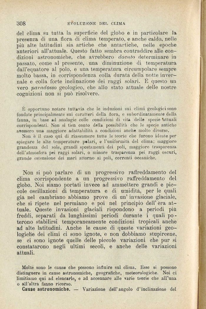 del clima su tutta la superficie del globo e in particolare la presenza di una fiora di clima temperato, e anche caldo, nelle più alte latitudini sia artiche che antartiche, nelle epoche anteriori all'attuale. Questo fatto sembra contraddire alle condizioni astronomiche, che avrebbero dovuto determinare in passato, come al presente, una diminuzione di temperatura dall'equatore al polo, e una temperatura circumpolare sempre molto bassa, in corrispondenza colla durata della notte invernale e colla forte inclinazione dei raggi solari. È questo un vero paradosso geologico, che allo stato attuale delle nostre cognizioni non si può risolvere.