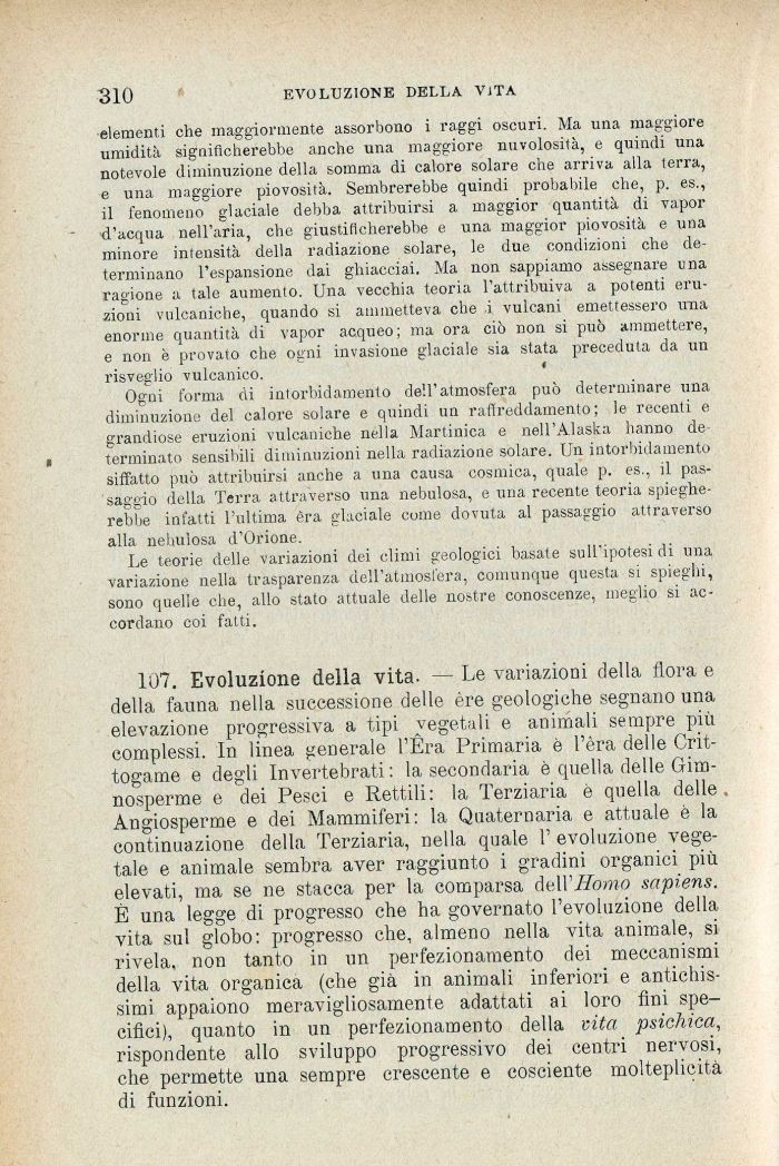 107. Evoluzione della vita. — Le variazioni della flora e della fauna nella successione delle ère geologiche segnano una elevazione progressiva a tipi vegetali e animali sempre più complessi. In linea generale l'Era Primaria è l'èra delle Crittogame e degli Invertebrati: la secondaria è quella delle Gim-nosperme e dei Pesci e Rettili: la Terziaria è quella delle Angiosperme e dei Mammiferi: la Quaternaria e attuale è la continuazione della Terziaria, nella quale 1' evoluzione vegetale e animale sembra aver raggiunto i gradini organici più elevati, ma se ne stacca per la comparsa dell 'Homo sapiens. È una legge di progresso che ha governato l'evoluzione della vita sul globo: progresso che, almeno nella vita animale, si rivela, non tanto in un perfezionamento dei meccanismi della vita organica (che già in animali inferiori e antichissimi appaiono meravigliosamente adattati ai loro fini specifici), quanto in un perfezionamento della vita psichica, rispondente allo sviluppo progressivo dei centri nervosi, che permette una sempre crescente e cosciente molteplicità di funzioni.