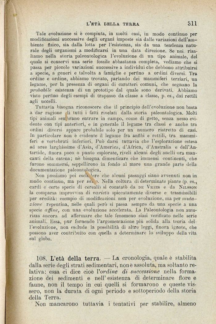 108. L'età della terra. — La cronologia, quale è stabilita dalla serie degli strati sedimentari, none assoluta, ma soltanto relativa: essa ci dice cioè Vordine di successione nella formazione dei sedimenti e nell' esistenza di determinare flore e faune, non il tempo in cui quelli si formarono e queste vissero, non la durata di ogni periodo e sottoperiodo della storia della Terra.