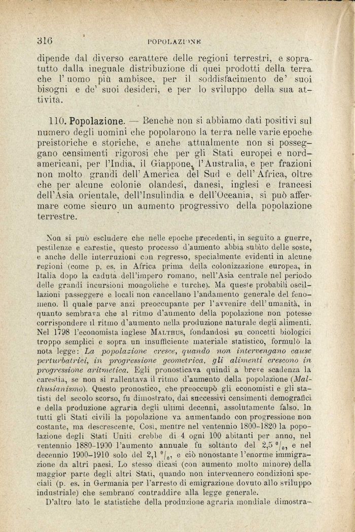 Non si può escludere che nelle epoche precedenti, in seguito a guerre, pestilenze e carestie, questo processo d'aumento abbia subito delle soste, e anche delle interruzioni Ci>n regresso, specialmente evidenti in alcune regioni (come p. es. in Africa prima della colonizzazione europea, in Italia dopo la caduta dell'impero romano, nell'Asia centrale nel periodo delle grandi incursioni mongoliche e turche). Ma queste probabili oscillazioni passeggere e locali non cancellano l'andamento generale del fenomeno. 11 quale parve anzi preoccupante per l'avvenire dell'umanità, in quanto sembrava che al ritmo d'aumento della popolazione non potesse corrispondere il ritmo d'aumento nella produzione naturale degli alimenti. Nel 1798 l'economista inglese Malthus, fondandosi su concetti biologici troppo semplici e sopra un insufficiente materiale statistico, formulò la nota legge: ha popolazione cresce, quando non intervengano cause perturbatrici, in progressione geometrica, gli alimenti crescono in progressione aritmetica. Egli pronosticava quindi a breve scadenza la carestia, se non si rallentava il ritmo d'aumento della popolazione (Mal-tliusianismo). Questo pronostico, che preoccupò gli economisti e gli statisti del secolo scorso, fu dimostrato, dai successivi censimenti demogralìci e della produzione agraria degli ultimi decenni, assolutamente falso. In tutti gli Stati civili la popolazione va aumentando con progressione non costante, ma descrescente. Cosi, mentre nel ventennio 1800-1820 la popolazione degli Stati Uniti crebbe di 4 ogni 100 abitanti per anno, nel ventennio 1880-1900 l'aumento annuale fu soltanto del 2,5 °/„, e nel decennio 1900-1910 solo del 2,1 °/0, e ciò nonostante l'enorme immigrazione da altri paesi. Lo stesso dicasi (con aumento molto minore) della maggior parte degli altri Stati, quando non intervennero condizioni speciali (p. es. in Germania per l'arresto di emigrazione dovuto allo sviluppo industriale) che sembrano contraddire alla legge generale.
