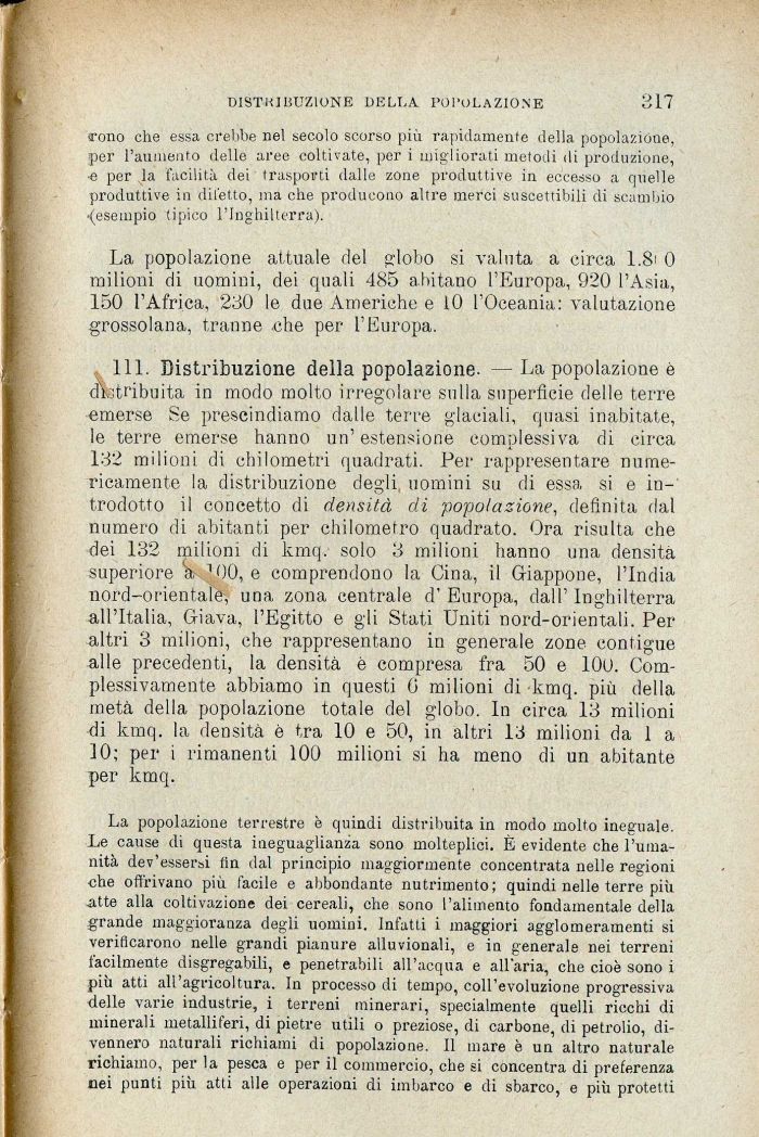 La popolazione attuale del globo si valuta a circa l.Si 0 milioni di uomini, dei quali 485 abitano l'Europa, 920 l'Asia, 150 l'Africa, 230 le due Americhe e 10 l'Oceania: valutazione grossolana, tranne che per l'Europa.