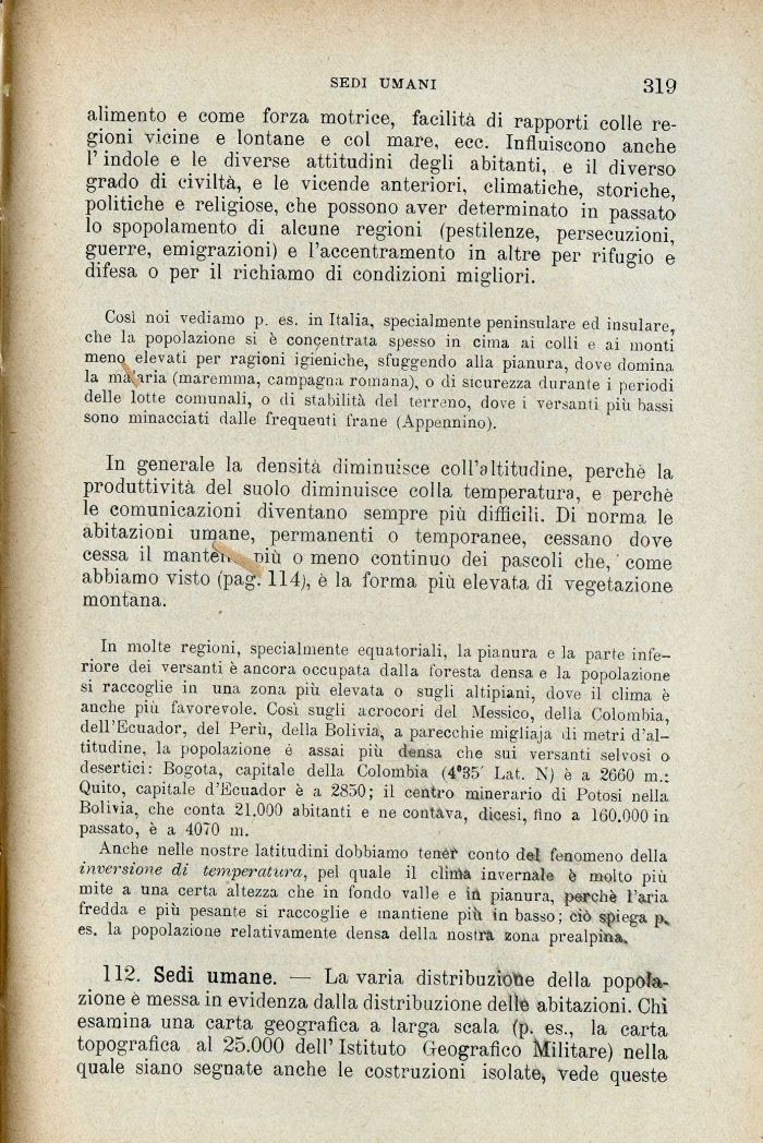 Cosi noi vediamo p. es. in Italia, specialmente peninsulare ed insulare, che la popolazione si è concentrata spesso in cima ai colli e ai monti meno elevati per ragioni igieniche, sfuggendo alla pianura, dove domina la malaria (maremma, campagna romana), o di sicurezza durante i periodi delle lotte comunali, o di stabilità del terreno, dove i versanti più bassi sono minacciati dalle frequenti frane (Appennino).
