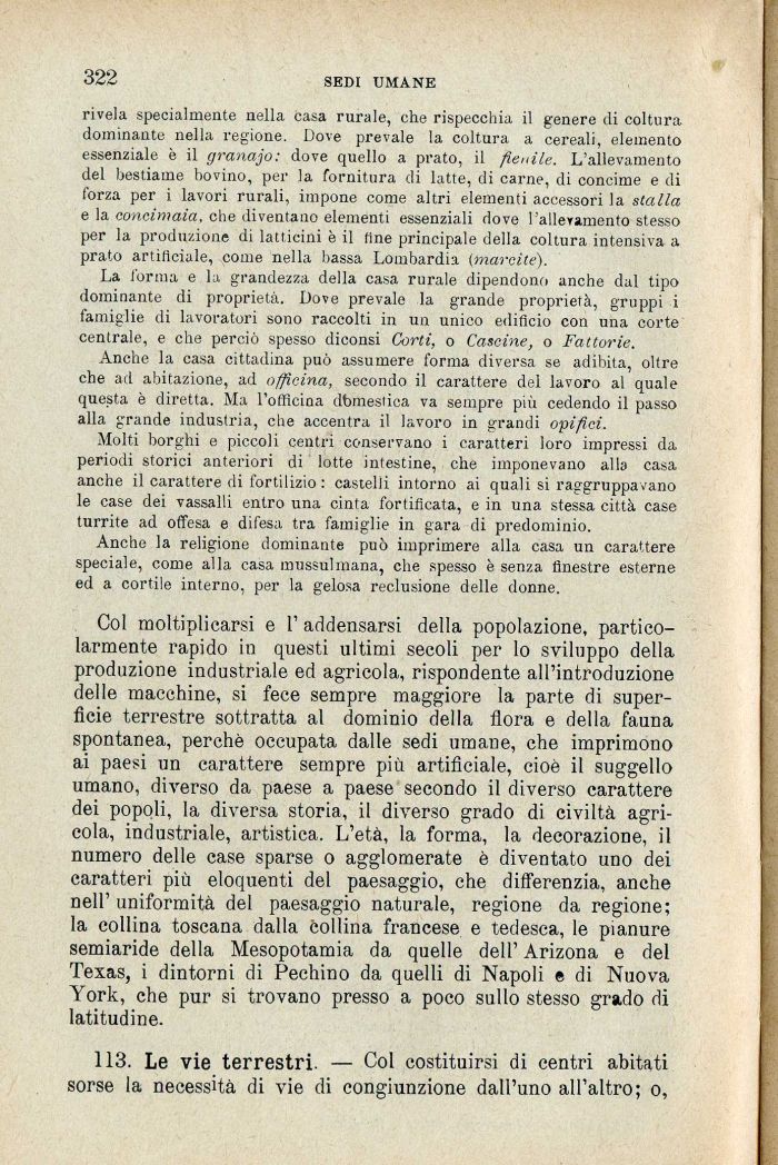 Col moltiplicarsi e 1' addensarsi della popolazione, particolarmente rapido in questi ultimi secoli per lo sviluppo della produzione industriale ed agricola, rispondente all'introduzione delle macchine, si fece sempre maggiore la parte di superficie terrestre sottratta al dominio della flora e della fauna spontanea, perchè occupata dalle sedi umane, che imprimono ai paesi un carattere sempre più artificiale, cioè il suggello umano, diverso da paese a paese secondo il diverso carattere dei popoli, la diversa storia, il diverso grado di civiltà agricola, industriale, artistica. L'età, la forma, la decorazione, il numero delle case sparse o agglomerate è diventato uno dei caratteri più eloquenti del paesaggio, che differenzia, anche nell' uniformità del paesaggio naturale, regione da regione; la collina toscana dalla èollina francese e tedesca, le pianure semiaride della Mesopotamia da quelle dell' Arizona e del Texas, i dintorni di Pechino da quelli di Napoli e di Nuova York, che pur si trovano presso a poco sullo stesso grado di latitudine.