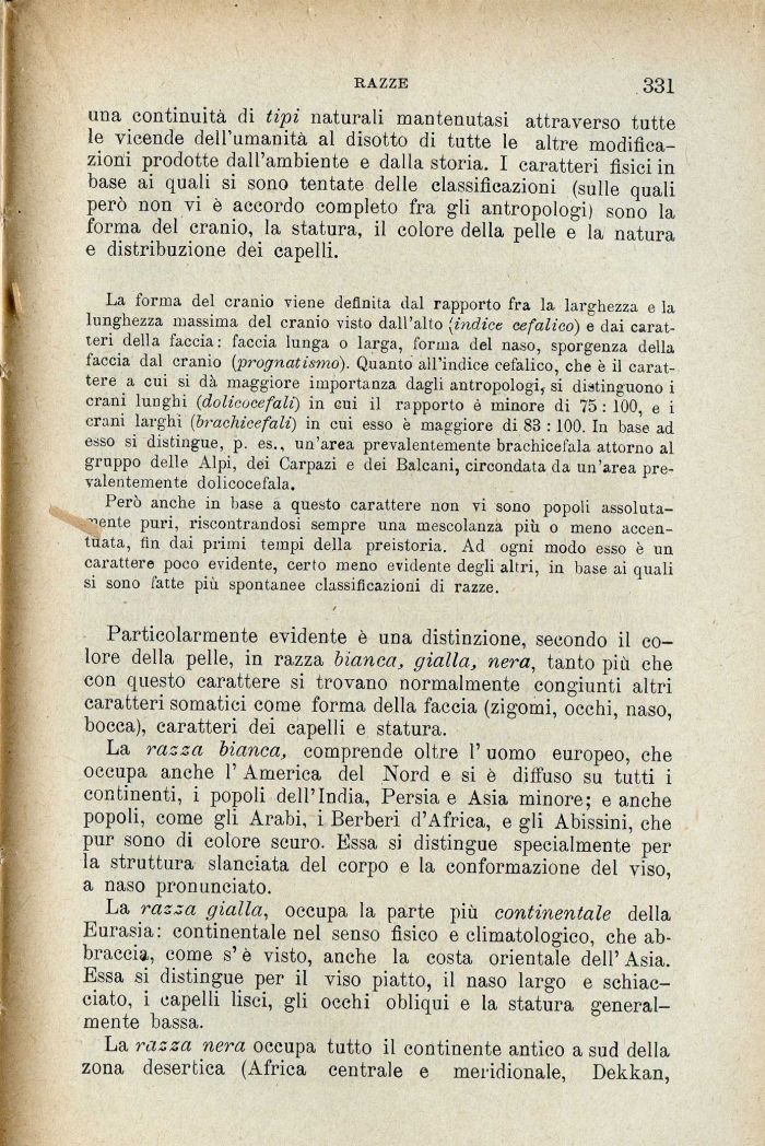 una continuità di tipi naturali mantenutasi attraverso tutte le vicende dell'umanità al disotto di tutte le altre modificazioni prodotte dall'ambiente e dalla storia. I caratteri tìsici in base ai quali si sono tentate delle classificazioni (sulle quali però non vi è accordo completo fra gli antropologi) sono la forma del cranio, la statura, il colore della pelle e la natura e distribuzione dei capelli.