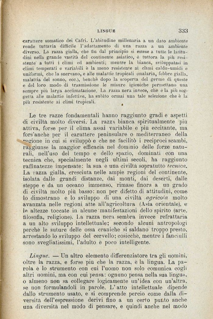 Lingue. — Un altro elemento differenziatore tra gli uomini, oltre la razza, e forse più che la razza, è la lingua. La parola è lo strumento con cui l'uomo non solo comunica cogli altri uomini, ma con cui pensa: ognuno pensa nella sua lingun, o almeno non sa collegare logicamente un'idea con un'altra, se non formulandoli in parole. L'atto intellettuale dipende dallo strumento usato, e si comprende perciò come dalla diversità dell'espressione derivi fino a un certo punto anche una diversità nel modo di pensare, e quindi anche nel modo