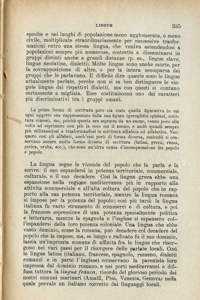 La lingua segue le vicende del popolo che la parla e la scrive: il suo espandersi in potenza territoriale, commerciale, culturale, e il suo decadere. Così la lingua greca ebbe una espansione nella regione mediterranea più in rapporto alla attività commerciale e all'alta coltura del popolo che in rapporto alla sua potenza territoriale, mentre la lingua romana si impose per la potenza del popolo; così più tardi la lingua italiana fu vasto strumento di commerci e di coltura, e poi la francese espressione di una potenza specialmente politica e letteraria, mentre la spagnola e l'inglese si espansero col-l'espandersi della loro potenza coloniale. Una lingua che ebbe vasto dominio, come la romana, può decadere col decadere del popolo che la impose, ma, se lungo e radicato fu il suo dominio, lascia un'impronta comune di affinità fra le lingue che risorgono nei vari paesi per il risorgere delle parlate locali. Così le lingue latine (italiano, francese, spagnolo, rumeno, dialetti romanzi e in parte l'inglese) conservano la parentela loro impressa dal dominio romano, e nei porti mediterranei è diffusa tuttora la lingua franca, ricordo del glorioso periodo dei nostri comuni marinari (Amalfi, Pisa, Venezia, Genova) nella quale prevale un italiano corretto dai linguaggi locali.