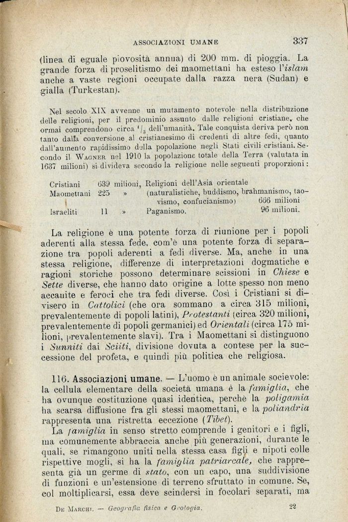 116. Associazioni umane. — L'uomo è un animale socievole: la cellula elementare della società umana è la famiglia, che ha ovunque costituzione quasi identica, perchè la -poligamia ha scarsa diffusione fra gli stessi maomettani, e la poliandria rappresenta una ristretta eccezione (Tibet).