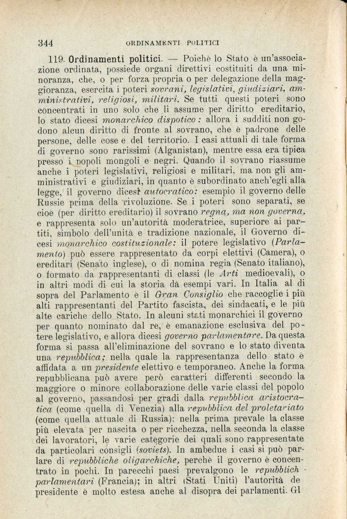 119. Ordinamenti politici. — Poiché lo Stato è un'associazione ordinata, possiede organi direttivi costituiti da una minoranza, che, o per forza propria o per delegazione della maggioranza, esercita i poteri sovrani, legislativi, giudiziari, amministrativi, religiosi, militari. Se tutti questi poteri sono concentrati in uno solo che li assume per diritto ereditario, lo stato dicesi monarchico dispotico : allora i sudditi non godono alcun diritto di fronte al sovrano, che è padrone delle persone, delle cose e del territorio. I casi attuali di tale forma di governo sono rarissimi (Alganistan), mentre essa era tipica presso i nopoli mongoli e negri. Quando il sovrano riassume anche i poteri legislativi, religiosi e militari, ma non gli amministrativi e giudiziari, in quanto è subordinato anch'egli alla legge, il governo dicesfr autocratico : esempio il governo delle Russie prima della rivoluzione. Se i poteri sono separati, se cioè (per diritto ereditario) il sovrano regna, ma non governa, e rappresenta solo un'autorità moderatrice, superiore ai partiti, simbolo dell'unità e tradizione nazionale, il Governo dicesi monarchico costituzionale: il potere legislativo (Parlamento) può essere rappresentato da corpi elettivi (Camera), o ereditari (Senato inglese), o di nomina regia (Senato italiano), o formato da rappresentanti di classi (le Arti medioevali), o in altri modi di cui la storia dà esempi vari. In Italia al di sopra del Parlamento è il Gran Consiglio che raccoglie i più alti rappresentanti del Partito fascista, dei sindacati, e le più alte cariche dello Stato. In alcuni st&ti monarchici il governo per quanto nominato dal re, è emanazione esclusiva del potere legislativo, e allora dicesi governo parlamentare. Da questa forma si passa all'eliminazione del sovrano e lo stato diventa una repubblica ; nella quale la rappresentanza dello stato è affidata a un presidente elettivo e temporaneo. Anche la forma repubblicana può avere però caratteri differenti secondo la maggiore o minore collaborazione delle varie classi del popolo al governo, passandosi per gradi dalla repubblica aristocratica (come quella di Venezia) alla repubblica del proletariato (come quella attuale di Russia): nella prima prevale la classe più elevata per nascita o per ricchezza, nella seconda la classe dei lavoratori, le varie categorie dei quali sono rappresentate da particolari consigli (soviets). In ambedue i casi si può parlare di repubbliche oligarchiche, perchè il governo è concentrato in pochi. In parecchi paesi prevalgono le repubblich ¦ parlamentari (Francia); in altri (Stati Uniti) l'autorità de presidente è molto estesa anche al disopra dei parlamenti. GÌ